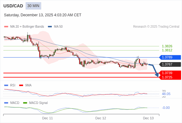技术点评: RSI技术指标小于中性区域50。 MACD技术指标处在其信号线之下看空。 配置为负。 此外,价位低于其20天及50天移动平均线 ( 分别位于1.3767 和1.3769 )。