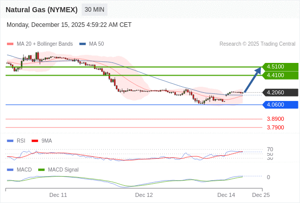 备选策略: 如跌破 4.0600 ,Natural Gas (NYMEX) (JAN6) 目标方向定在 3.8900 和 3.7900 。